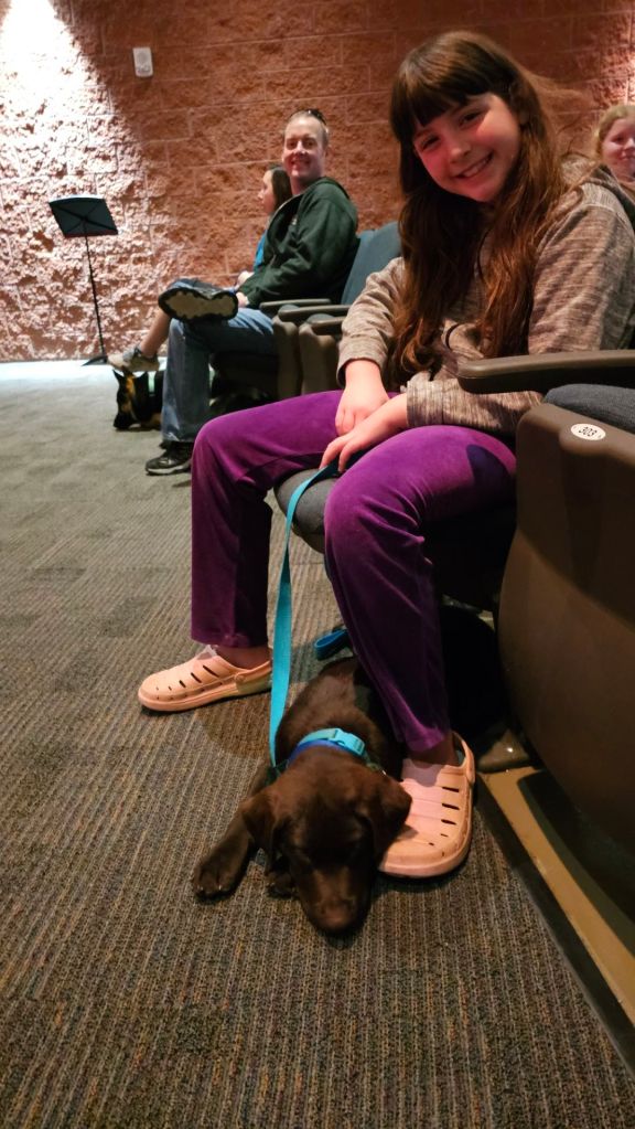 Musicals feature unexpected loud noises and lighting changes. This gives the puppies opportunity for exposure to large groups of new people without being immediately overwhelming. If you’re keeping track, you’ll remember we recently attended a musical dress rehearsal at Appoquinimink High School. Repeated exposure to these environments helps build familiarity and confidence in the puppies. This dress rehearsal featured some crowd members of the stuffed animal variety – Just another good training opportunity to leave behind a tempting distraction. Also, what can we say, we love supporting our local community arts!