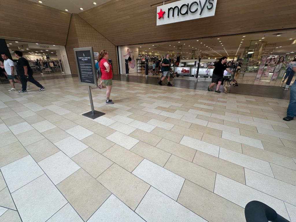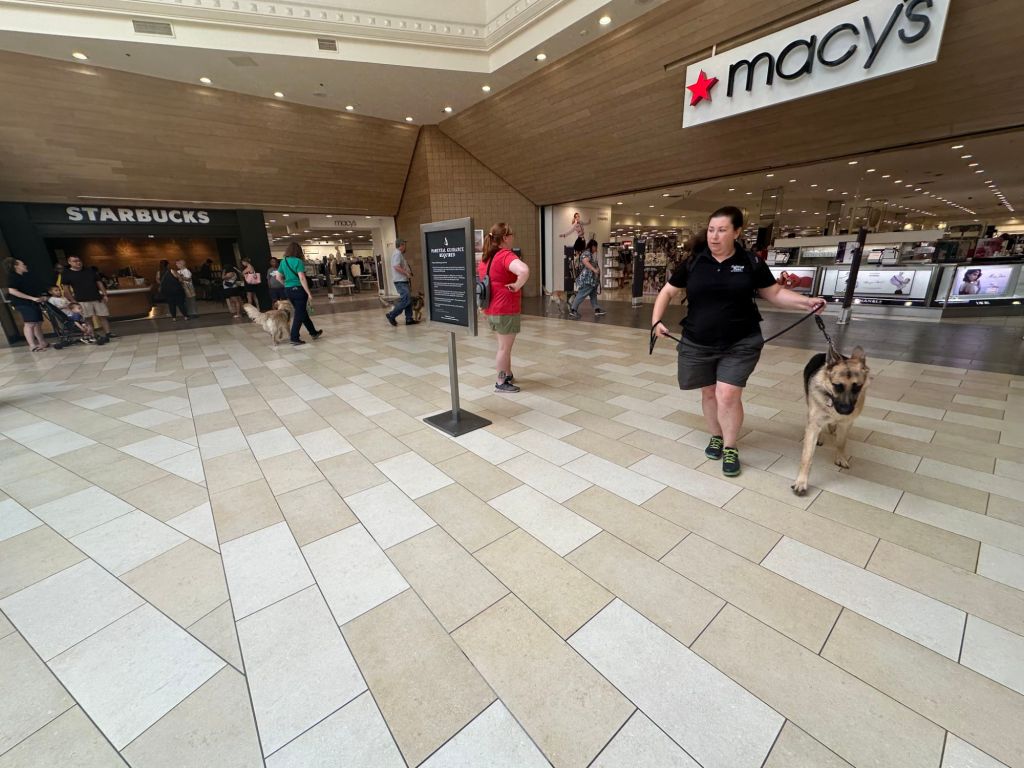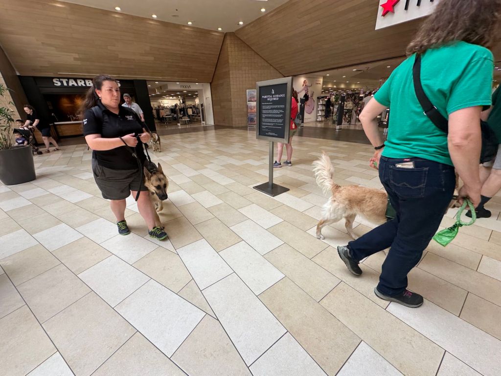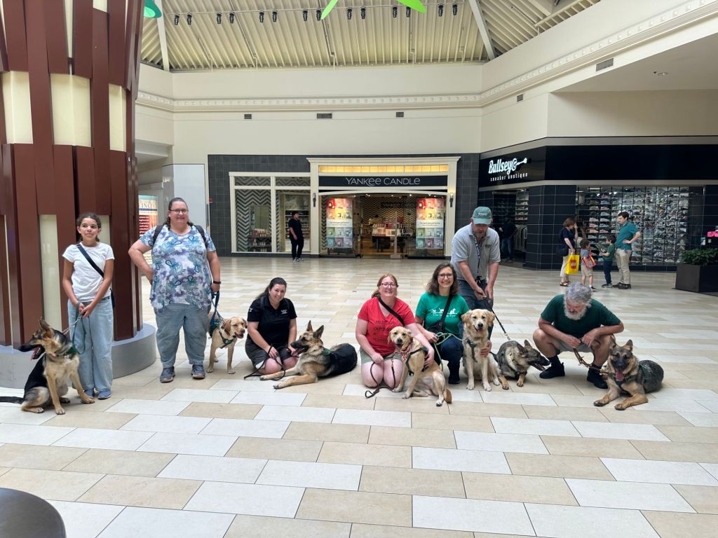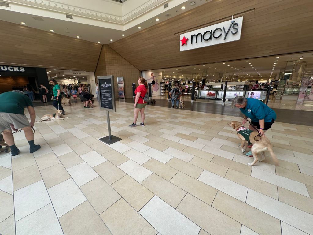 Guiding Paws recently practiced their leash skills at the Christiana Mall. We love a good mall walk – it’s accessible for pups of all ages, it is indoors which is nice in the dead of summer or winter, it’s easy to plan and meet up, and there’s always a lot of activity. This is an ideal experience for our puppies to be in an exciting new place, learn to pay attention to their raiser and follow commands. We thank the folks at the Christiana Mall for being longtime hosts of Guiding Paws of Delaware over the years.